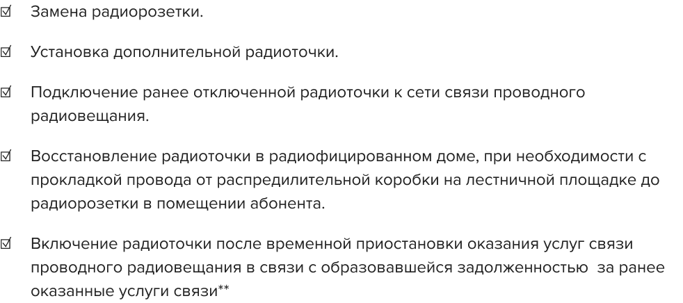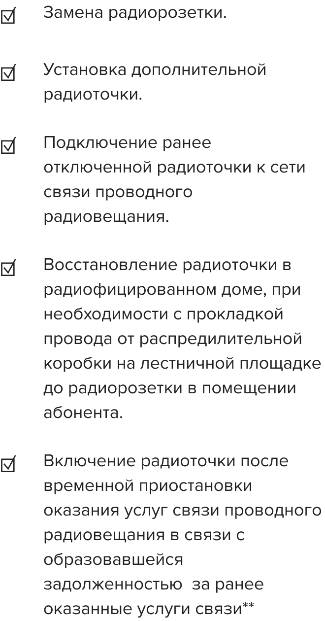С радиоточкой мы бесплатно осуществляем следующие услуги: